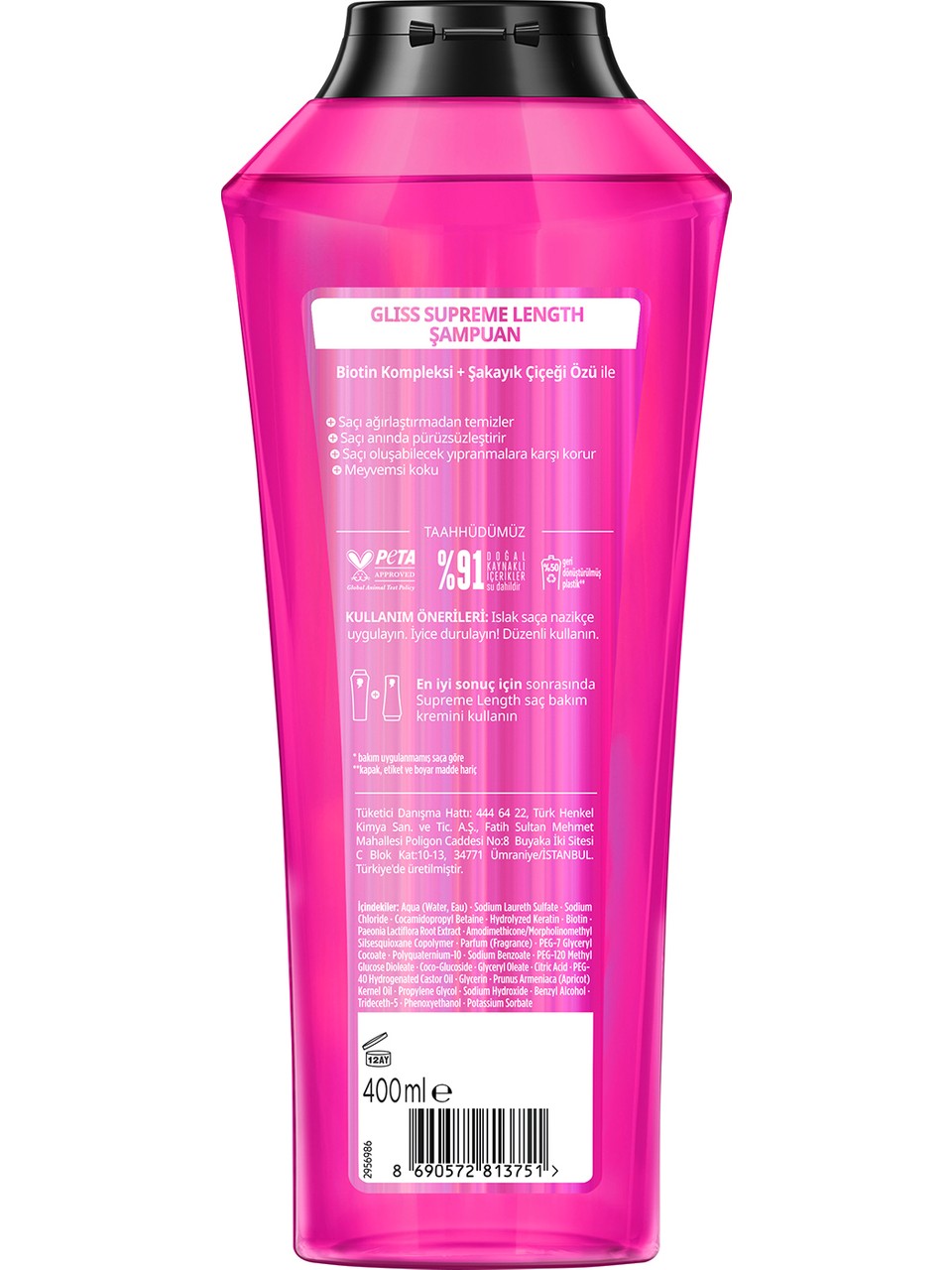شامپو Supreme Length حاوی ترکیبات مرطوبکنندهای مانند پانتنول (ویتامین B5) است که خشکی موها را برطرف کرده و به آنها نرمی و لطافت میبخشد.